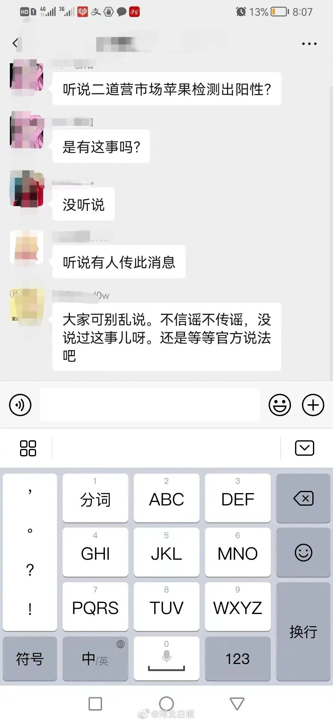 近日,河北承德隆化縣某微信群內(nèi)有消息稱:隆化縣二道營(yíng)市場(chǎng)蘋果檢測(cè)出陽(yáng)性。經(jīng)縣委網(wǎng)信辦與縣疫情防控辦及有關(guān)部門核實(shí),此信息為謠言。請(qǐng)大家不要盲目哄搶水果蔬菜等生活物資,造成不必要的聚集。目前隆化縣疫情防控工作正在平穩(wěn)進(jìn)行,并無(wú)異樣。在此提醒大家,不信謠、不傳謠、不造謠。