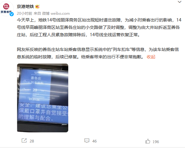 網(wǎng)友所反映的善各莊站車站乘客信息顯示系統(tǒng)中的“列車扣車”等信息,為該車站乘客信息系統(tǒng)的臨時(shí)故障,后續(xù)已修復(fù)。給乘客帶來的出行不便非常抱歉。