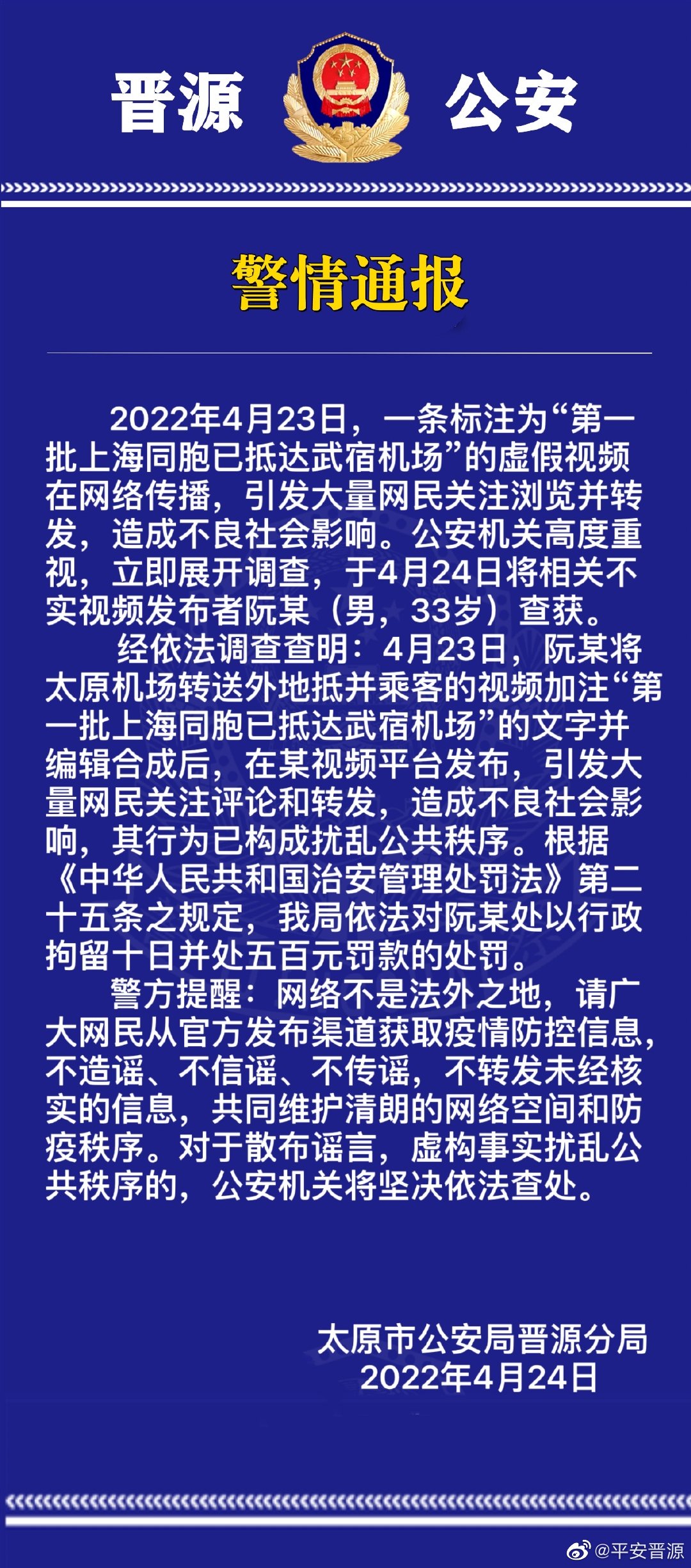 經(jīng)依法調(diào)查查明:4月23日,阮某將太原機(jī)場轉(zhuǎn)送外地抵并乘客的視頻加注“第一批上海同胞已抵達(dá)武宿機(jī)場”的文字并編輯合成后,在某視頻平臺(tái)發(fā)布,引發(fā)大量網(wǎng)民關(guān)注評論和轉(zhuǎn)發(fā),造成不良社會(huì)影響,其行為已構(gòu)成擾亂公共秩序。根據(jù)《中華人民共和國治安管理處罰法》第二十五條之規(guī)定,我局依法對阮某處以行政拘留十日并處五百元罰款的處罰。