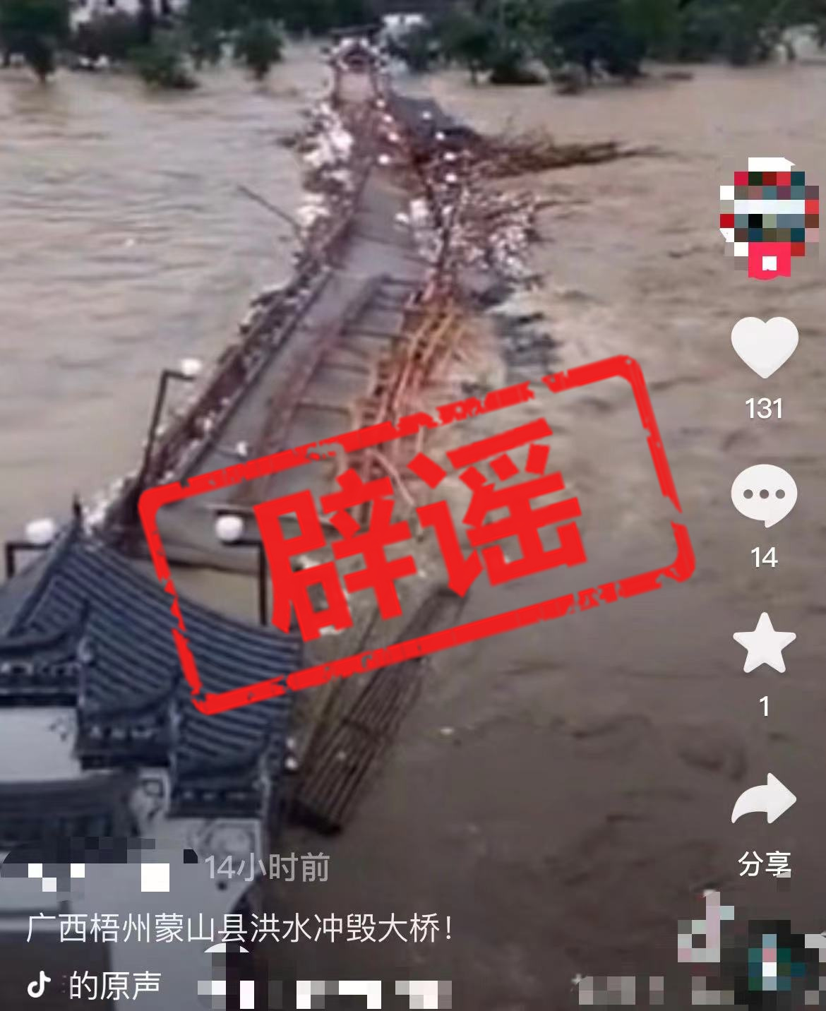 近日,有網(wǎng)友在某視頻平臺發(fā)布一條視頻稱:“廣西梧州蒙山縣洪水沖毀大橋”。