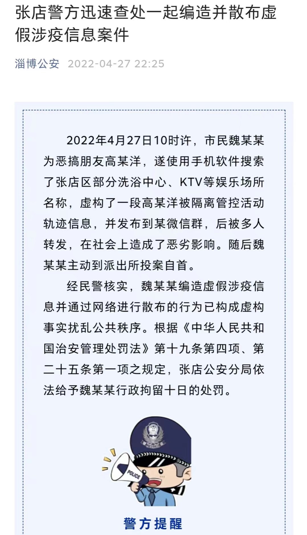 近日,淄博張店一條關(guān)于“高某洋”的確診病例流調(diào)信息在微信和朋友圈轉(zhuǎn)發(fā),引發(fā)關(guān)注。經(jīng)當?shù)毓矙C關(guān)核實,此流調(diào)信息為不實信息,系高某某的朋友魏某某為惡搞朋友虛構(gòu)的活動軌跡信息。因魏某某編造虛假涉疫信息并通過網(wǎng)絡(luò)進行散布的行為已構(gòu)成虛構(gòu)事實擾亂公共秩序,淄博市公安局張店分局依法給予魏某某行政拘留十日的處罰。