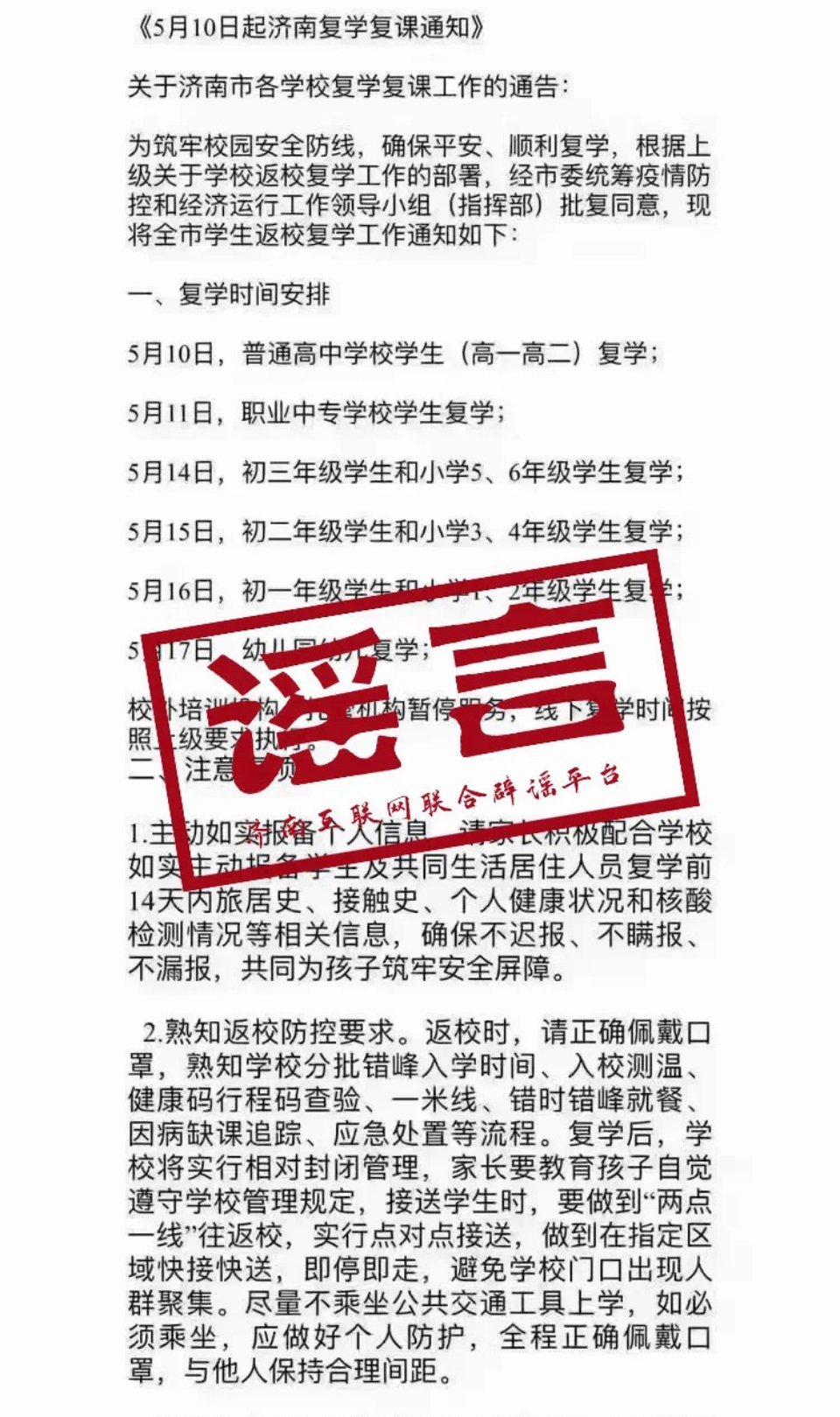 目前,濟南高中畢業(yè)年級學生已經返校復課,準備沖刺夏季高考。與此同時,其他年級何時能返校復課,同樣備受關注。近日,一條消息在朋友圈流傳:“5月10日起,中小學各年級陸續(xù)返校復課?!睂Υ?,濟南市教育局工作人員回復:假消息。如果有復課的決定,一定會通過官方權威渠道發(fā)布。