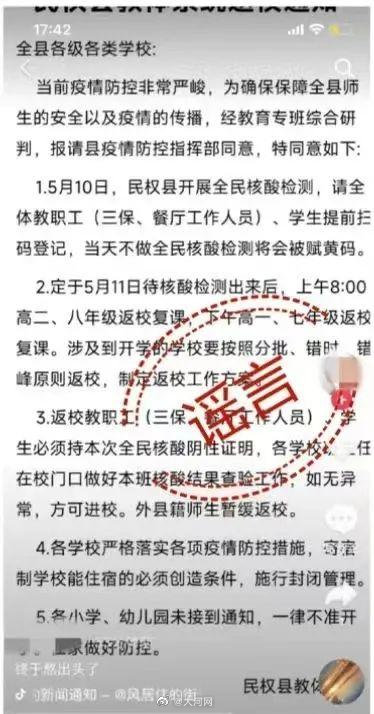 5月9日,有部分微信群、抖音及新媒體平臺(tái)假借民權(quán)縣教體局名義在網(wǎng)上傳播“民權(quán)縣教體系統(tǒng)返校通知”,經(jīng)核實(shí),屬不實(shí)信息!此信息誤導(dǎo)市民,擾亂了我縣疫情防控和教學(xué)秩序,造成不良社會(huì)影響。請(qǐng)縣直各學(xué)校、各鄉(xiāng)鎮(zhèn)中心學(xué)校、各教育單位,向家長(zhǎng)做好解釋。