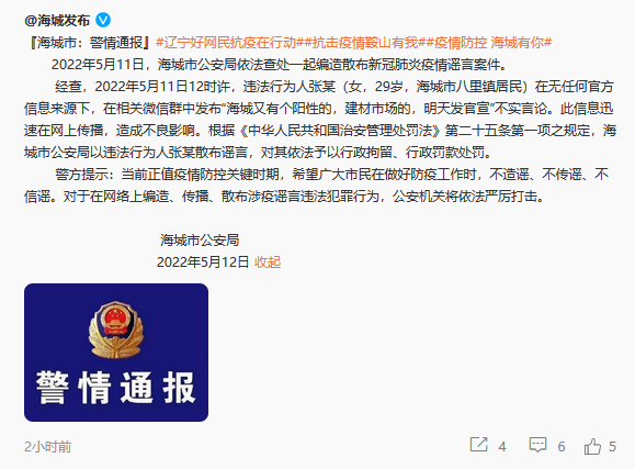 2022年5月11日,海城市公安局依法查處一起編造散布新冠肺炎疫情謠言案件。