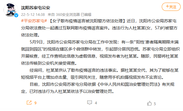 5月9日,沈陽市公安局蘇家屯分局在工作中發(fā)現(xiàn):有一條“‘陽性’患者隔離期限未滿就回到園區(qū)”的視頻在轄區(qū)多個微信群中轉(zhuǎn)發(fā),引起部分居民恐慌。蘇家屯分局立即組織開展核查,經(jīng)工作查明此信息為虛假信息,視頻發(fā)布者為杜某某。隨即,民警將杜某某依法傳喚到公安機關(guān)接受調(diào)查。