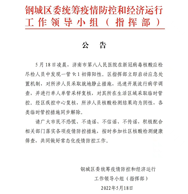 5月18日,有網(wǎng)民發(fā)布“萊鋼混采中發(fā)現(xiàn)一例陽性,目前正在緊急排查,按照疫情要求,今天金鼎南區(qū),金鼎北區(qū),御龍灣,創(chuàng)業(yè)園,金洪小區(qū)五個小區(qū)實行臨時封控”信息,鋼城區(qū)委統(tǒng)籌疫情防控和經(jīng)濟(jì)運(yùn)行工作領(lǐng)導(dǎo)小組(指揮部)發(fā)布公告,5月18日凌晨,濟(jì)南市第八人民醫(yī)院在新冠病毒核酸應(yīng)檢盡檢人員中發(fā)現(xiàn)一管9: 1初篩陽性。經(jīng)鋼城區(qū)疾控中心復(fù)核,所涉人員核酸檢測結(jié)果均為陰性。各類臨時管控措施同步解除。