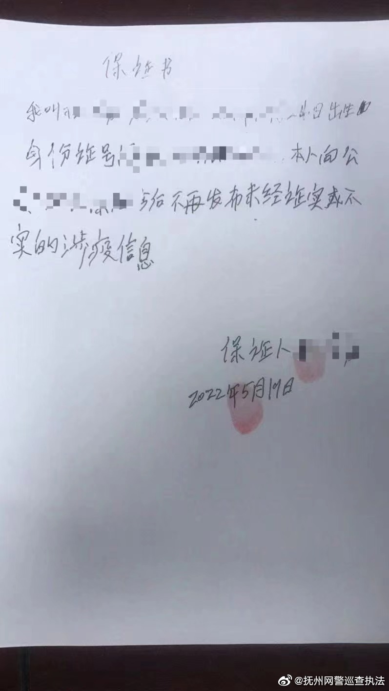 2022年5月19日,撫州網警在日常巡查工作中發(fā)現(xiàn),金溪網民在抖音平臺發(fā)布涉疫不實信息。金溪網安大隊聯(lián)合轄區(qū)派出所迅速出動,快速核查,找到該視頻發(fā)布者桂某。在辦案民警的批評教育下,桂某認識到自己的錯誤,當場刪除不實信息,并寫下保證書。
