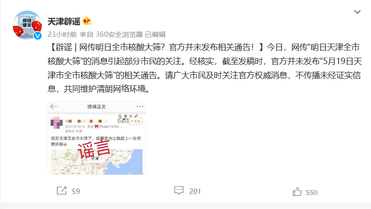 來源: 天津辟謠發(fā)布時(shí)間: 2022-05-19 16:07責(zé)任編輯: 王敏
