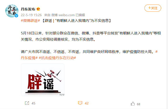 5月18日以來,針對部分群眾在微信、微博、抖音等平臺轉(zhuǎn)發(fā)“有朝鮮人進入丹東境內(nèi)”等相關(guān)情況,丹東市公安局經(jīng)調(diào)查核實,均為不實信息。