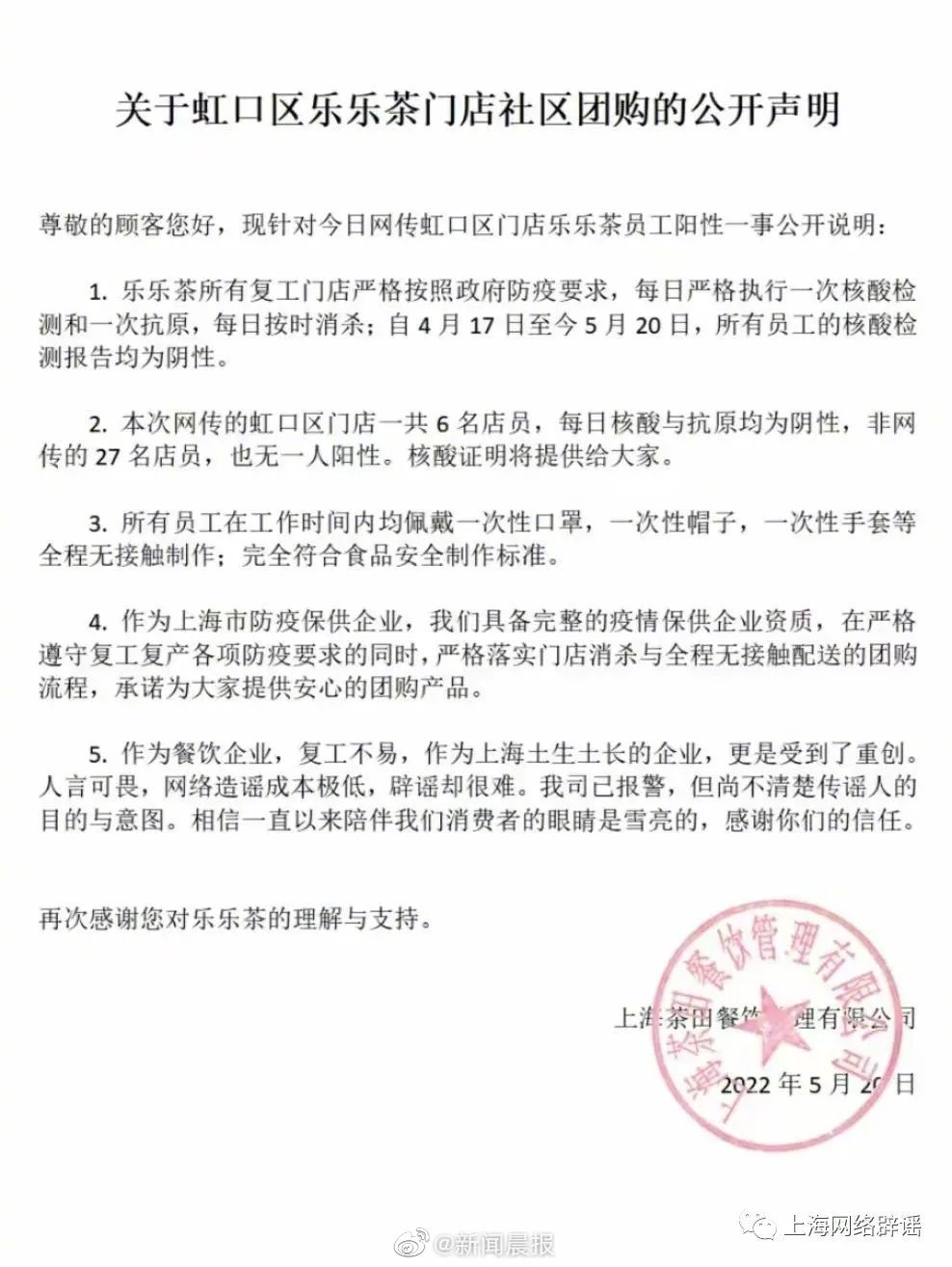 5月20日,針對(duì)上述傳言,虹口區(qū)樂樂茶門店發(fā)布一則聲明稱,所有復(fù)工門店嚴(yán)格按照政府防疫要求,每日嚴(yán)格執(zhí)行一次核酸檢測(cè)和一次抗原,每日按時(shí)消殺;自4月17日至今5月20日,所有員工的核酸檢測(cè)報(bào)告均為陰性。本次網(wǎng)傳的虹口區(qū)門店一共6名店員,每日核酸與抗原均為陰性。門店附上了所有員工的核酸證明截圖。聲明中還提到,作為上海市防疫保供企業(yè),樂樂茶具備完整的疫情保供企業(yè)資質(zhì),在嚴(yán)格遵守復(fù)工復(fù)產(chǎn)各項(xiàng)防疫要求的同時(shí)嚴(yán)格落實(shí)門店消殺與全程無接觸配送的團(tuán)購流程,承諾為大家提供安心的團(tuán)購產(chǎn)品。