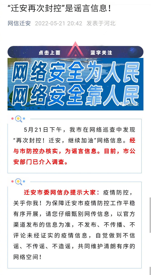 據(jù)“網(wǎng)信遷安”消息,5月21日下午,河北省唐山市遷安市在網(wǎng)絡(luò)巡查中發(fā)現(xiàn)“再次封控!遷安,繼續(xù)加油”網(wǎng)絡(luò)信息。經(jīng)與遷安市防控辦核實(shí),為謠言信息。目前,遷安市公安部門已介入調(diào)查。