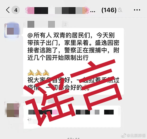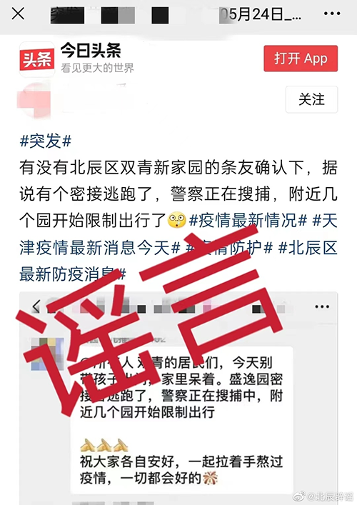 5月24日,網(wǎng)傳“雙青的居民們,今天別帶孩子出門,家里呆著。盛逸園密接者逃跑了,警察正在搜捕中,附近幾個(gè)園開始限制出行”,引發(fā)部分居民群眾和網(wǎng)民的質(zhì)疑與擔(dān)憂,造成不良影響。經(jīng)北辰區(qū)核實(shí),此信息為謠言。當(dāng)前,正值天津市疫情防控關(guān)鍵時(shí)期,天津市互聯(lián)網(wǎng)違法和不良信息舉報(bào)中心提醒廣大市民,積極配合疫情防控工作,不恐慌、不造謠、不信謠、不傳謠,關(guān)注官方權(quán)威發(fā)布。