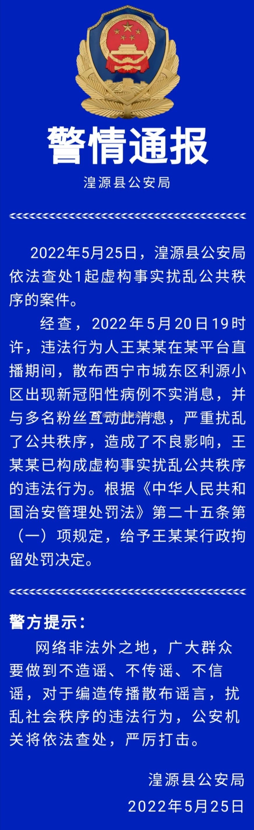 2022年5月25日,湟源縣公安局依法查處1起虛構(gòu)事實擾亂公共秩序的案件。