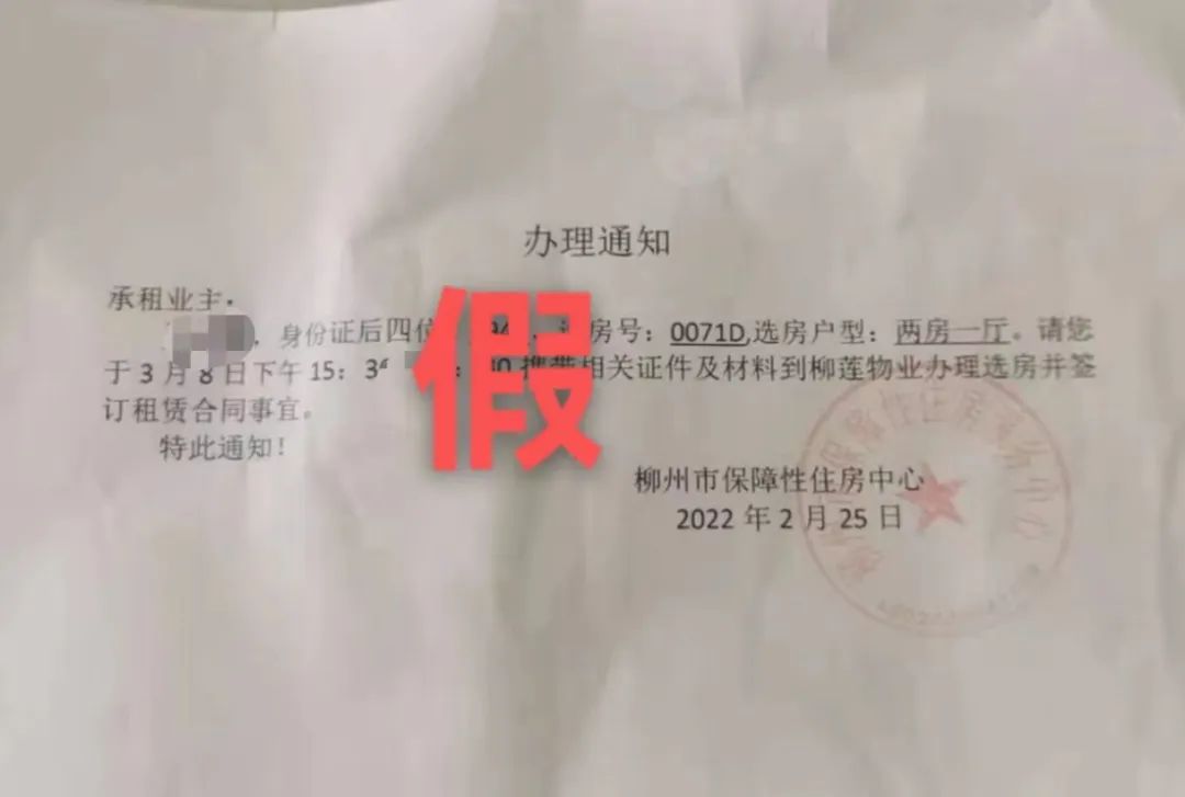 5月26日,記者從柳州市保障性住房服務(wù)中心了解到,今年2月以來,陸續(xù)有群眾到該中心和柳蓮新居公租房小區(qū)辦理公租房入住手續(xù)。工作人員核實發(fā)現(xiàn),《辦理通知》竟然是假的。目前,犯罪嫌疑人已被警方抓獲,經(jīng)初步核實,已經(jīng)有150多人被騙。