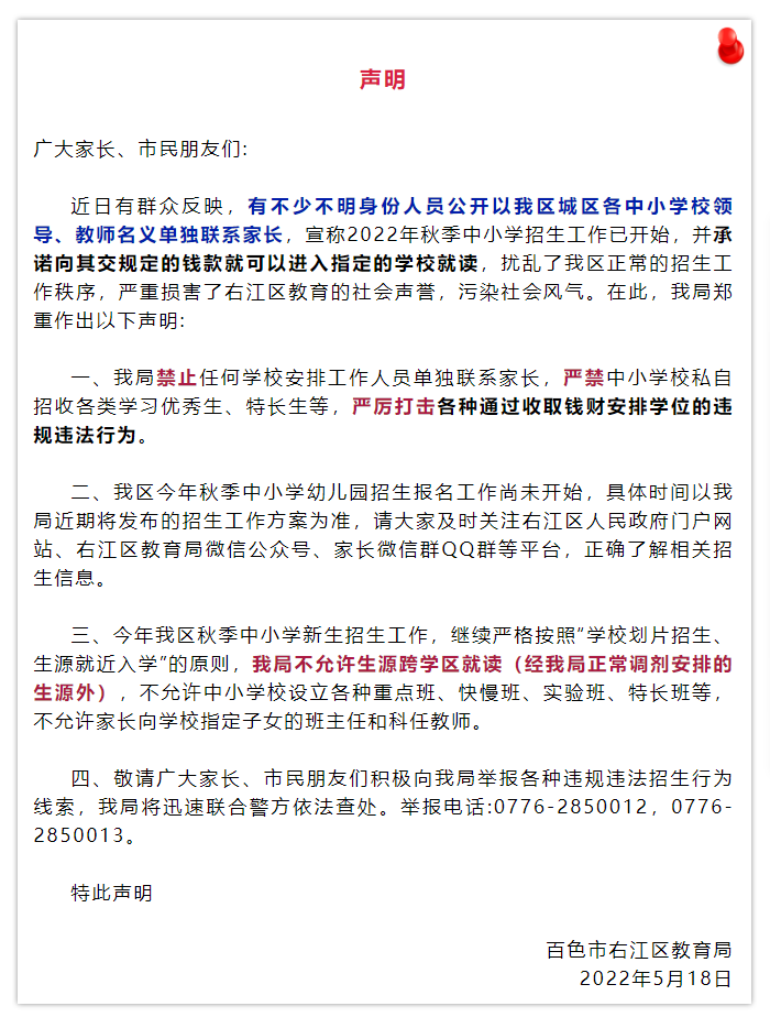 百色市右江區(qū)教育局聲明: