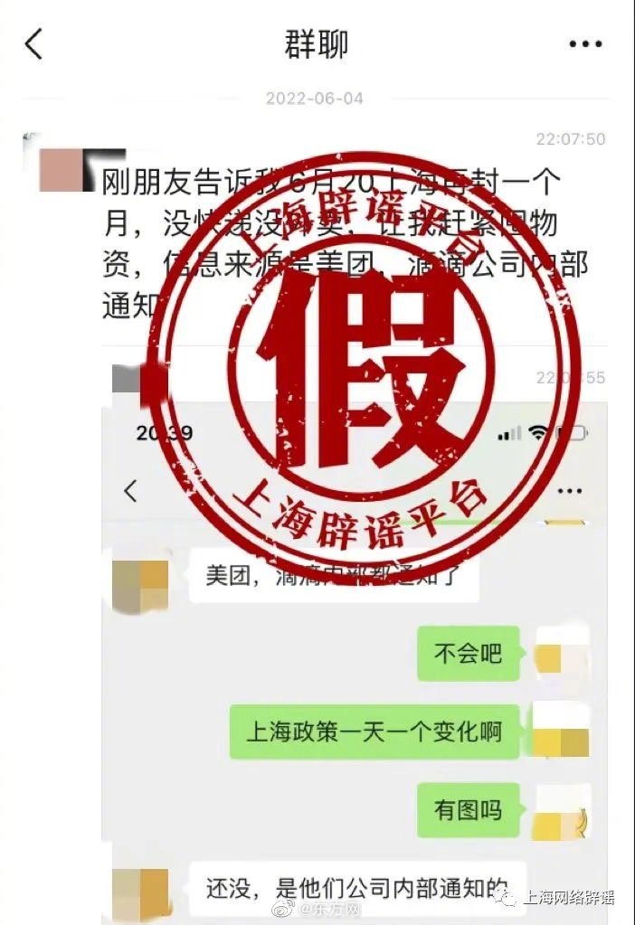 近日,微信圈群有傳言稱“6月20日上海再封一個月,沒快遞沒外賣……信息來源是美團、滴滴公司內部通知”。上海辟謠平臺向上海市新冠肺炎疫情防控工作領導小組辦公室(簡稱“市防控辦”)求證獲悉,傳言不實。全市目前沒有這個安排。