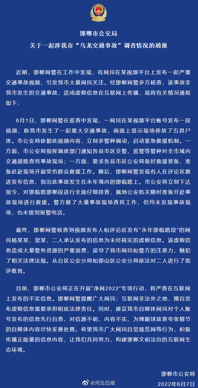 6月1日,邯鄲網(wǎng)警在巡查中發(fā)現(xiàn),一網(wǎng)民在某視頻平臺賬號發(fā)布一段視頻,稱我市發(fā)生了一起重大交通事故,畫面上顯示現(xiàn)場停放了五具尸體。市公安局依據(jù)此視頻內(nèi)容,立刻多警種調(diào)動,啟動緊急救援機制。一方面,市公安局指揮調(diào)度部門通知各縣市區(qū)交警、巡警等警種對全市域內(nèi)交通道路查找事故現(xiàn)場;一方面,要求各縣市區(qū)公安局備好救援裝備,準備趕赴現(xiàn)場開展受傷群眾救援工作。隨后,邯鄲網(wǎng)警發(fā)現(xiàn)有人在評論區(qū)跟進發(fā)布信息,指出此事故發(fā)生在永年境內(nèi)的邯臨路上。市公安局立刻下達指令,對邯臨路邯鄲段進行全面仔細排查,屬地公安機關(guān)隨時準備開赴事故現(xiàn)場進行救援。警方做了大量事故現(xiàn)場查找工作,但均未發(fā)現(xiàn)事故現(xiàn)場,也未接到報警電話。