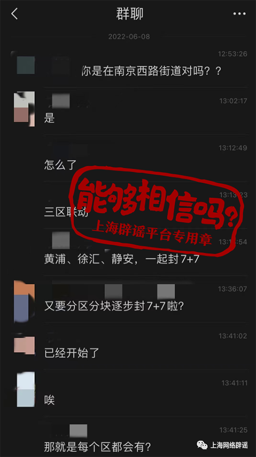 6月8日晚,一條“全市各區(qū)縣街道陸續(xù)開展階梯式小區(qū)閉環(huán)措施,執(zhí)行48小時核酸1-2次檢測……發(fā)現(xiàn)陽性小區(qū)執(zhí)行2+14天隔離,發(fā)現(xiàn)陽性密接2+12”的消息在圈群傳播。還有傳言稱,“上海實施地毯式篩查,每個居住地都會輪到48小時封閉,做二次核酸檢測,如檢出陽性,再封閉12天”,并附上了一張“今晚十二點封小區(qū)重點區(qū)域清單”。上海辟謠平臺接到很多網(wǎng)友留言,希望求證真?zhèn)?。對此傳言,上海市新冠肺炎疫情防控工作領(lǐng)導(dǎo)小組辦公室(簡稱“市防控辦”)答復(fù)表示,網(wǎng)傳“全市各區(qū)縣街道陸續(xù)開展階梯式小區(qū)閉環(huán)措施”“上海將實施地毯式篩查”以及“今晚十二點封小區(qū)重點區(qū)域清單”均為謠言。