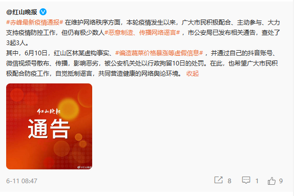 其中,6月10日,紅山區(qū)林某虛構(gòu)事實、編造蔬菜價格暴漲等虛假信息,并通過自己的抖音賬號、微信視頻號散布、傳播,影響惡劣,被公安機(jī)關(guān)處以行政拘留10日的處罰。在此,也希望廣大市民積極配合防疫工作,自覺抵制謠言,共同營造健康的網(wǎng)絡(luò)輿論環(huán)境。