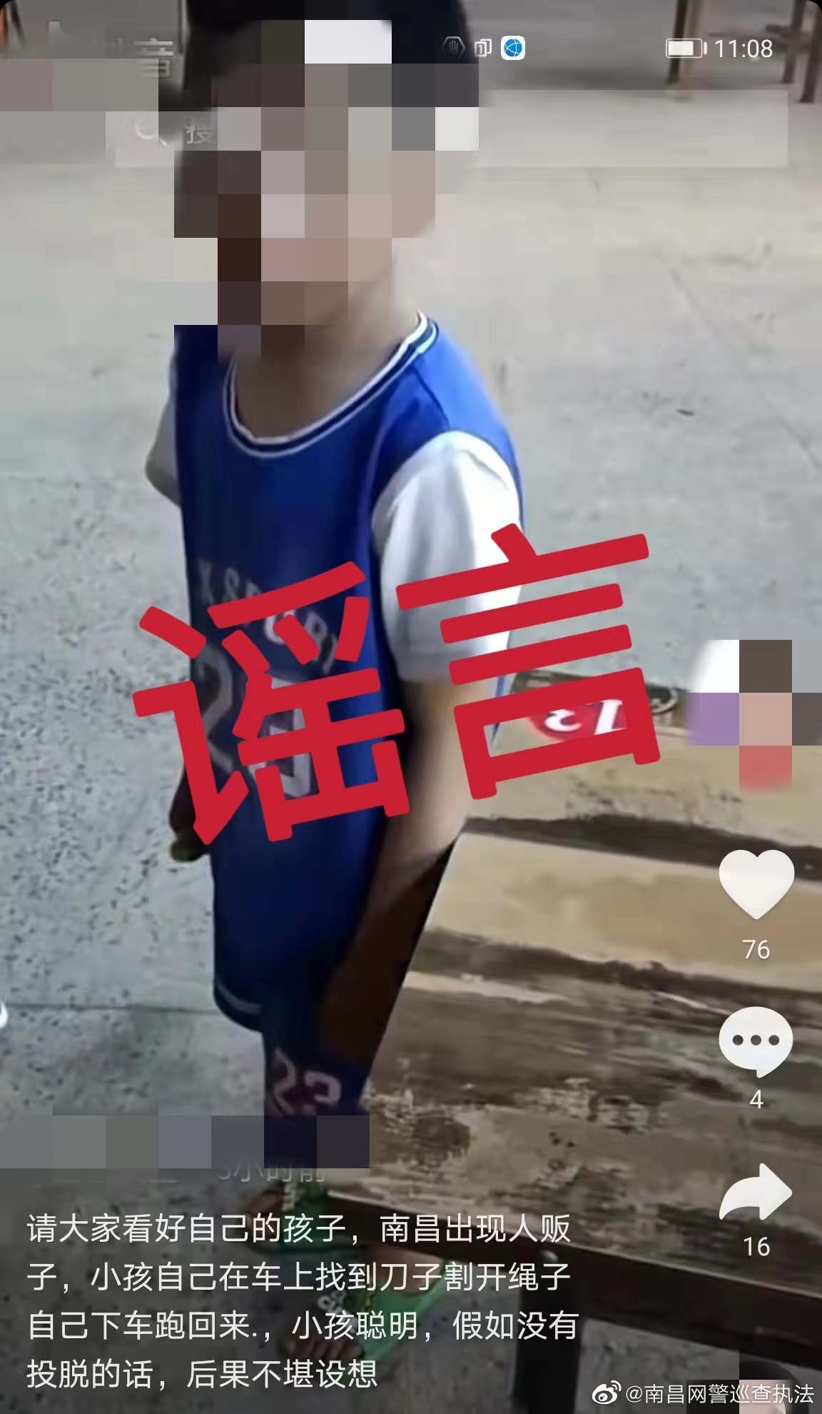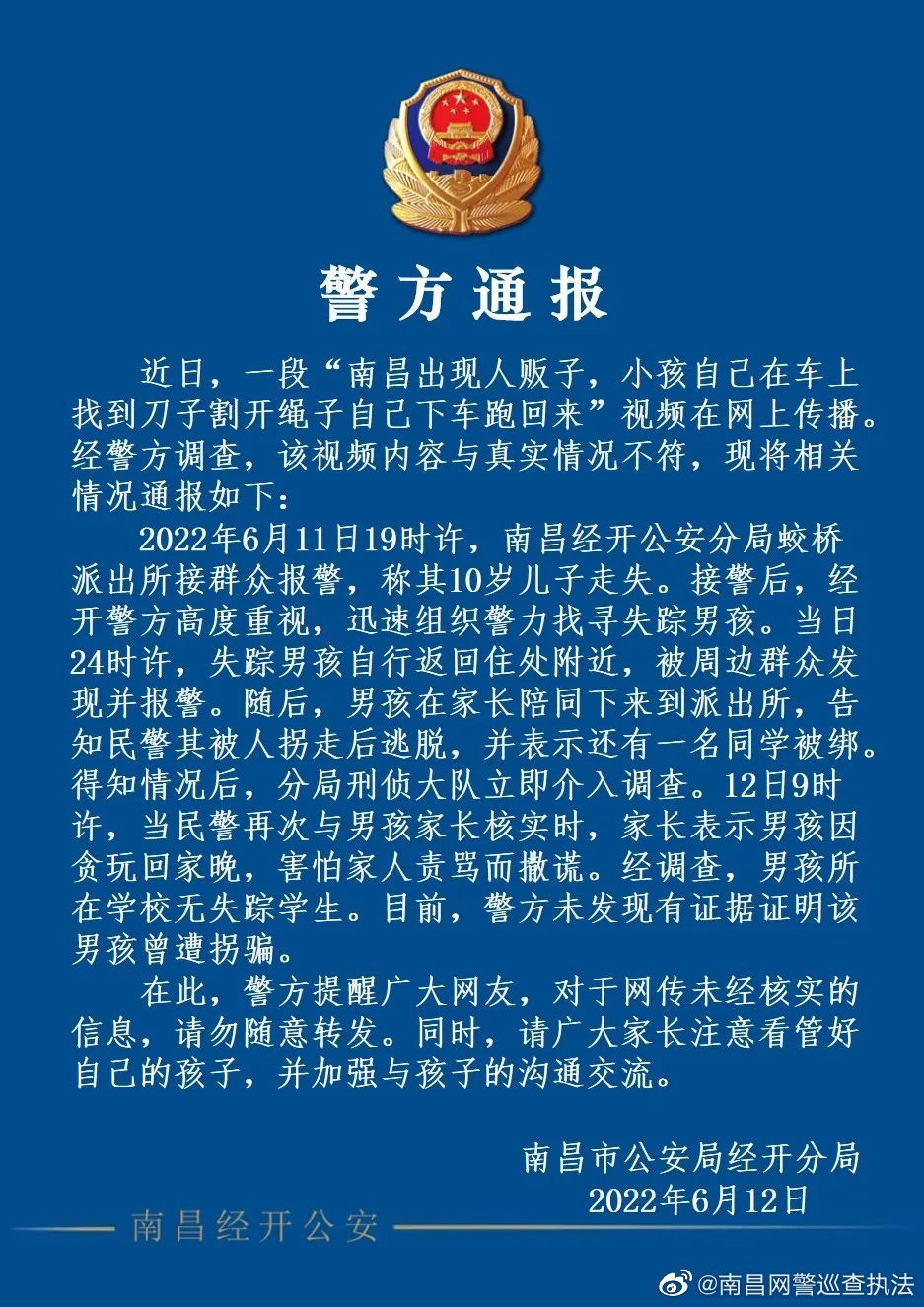 近日,江西南昌一段“南昌出現(xiàn)人販子,小孩自己在車上找到刀子割開繩子自己下車跑回來”視頻在網(wǎng)上傳播,視頻顯示,一男孩自稱被綁架,在車上找到刀后割開繩子逃跑。6月12日,南昌市公安局經(jīng)開分局發(fā)布通報稱該信息不實,系因男孩貪玩回家晚,害怕家人責罵而撒謊。經(jīng)調(diào)查,男孩所在學校無失蹤學生。目前,警方未發(fā)現(xiàn)有證據(jù)證明該男孩曾遭拐騙。