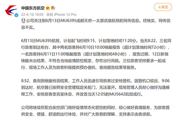 公司關注到6月13日MU6395成都天府—太原武宿航班的網(wǎng)傳信息。經(jīng)核實,網(wǎng)傳信息不實。