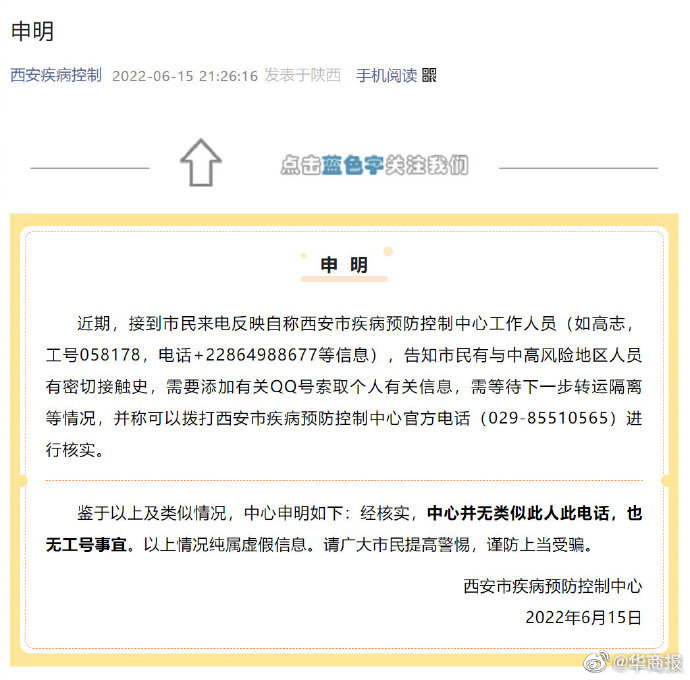 西安市疾控中心提醒:近期,接到市民來(lái)電反映自稱西安市疾病預(yù)防控制中心工作人員(如高志,工號(hào)058178,電話+22864988677等信息),告知市民有與中高風(fēng)險(xiǎn)地區(qū)人員有密切接觸史,需要添加有關(guān)QQ號(hào)索取個(gè)人有關(guān)信息,需等待下一步轉(zhuǎn)運(yùn)隔離等情況,并稱可以撥打西安市疾病預(yù)防控制中心官方電話(029-85510565)進(jìn)行核實(shí)。