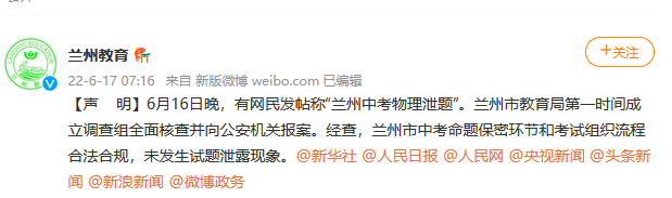 6月16日晚,有網民發(fā)帖稱“蘭州中考物理泄題”。蘭州市教育局第一時間成立調查組全面核查并向公安機關報案。經查,蘭州市中考命題保密環(huán)節(jié)和考試組織流程合法合規(guī),未發(fā)生試題泄露現象。