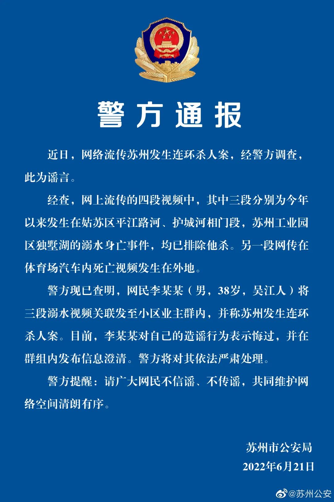 近日,網(wǎng)絡(luò)流傳蘇州發(fā)生連環(huán)殺人案,經(jīng)警方調(diào)查,此為謠言!