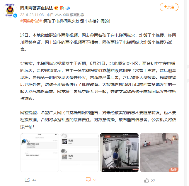 經(jīng)核實,電梯間縱火視頻發(fā)生于近期,6月21日,北京順義某小區(qū),兩名初中生在電梯間玩火,監(jiān)控視頻顯示,其中一名男孩將疑似酒精的液體倒在了水管上點燃,然后逃離現(xiàn)場。居民第一時間發(fā)現(xiàn)火情并撲滅,未造成嚴(yán)重后果,之后物業(yè)人員報警。民警接警后到場處置,對孩子和家長進行了批評教育。大樓爆燃視頻則為以前西南某地發(fā)生的一起天然氣爆燃事故。網(wǎng)友將二者憑空聯(lián)系到一起,并附文案稱兩孩子電梯間玩火導(dǎo)致樓被炸毀。