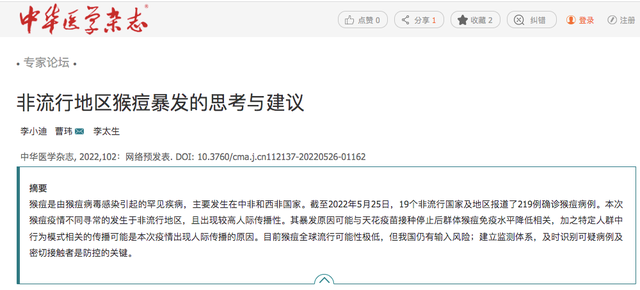 論文中對(duì)猴痘出現(xiàn)跨洲境流行推測(cè)有以下可能:1.天花疫苗停止接種后,猴痘病毒免疫力降低;2.個(gè)體特征及行為模式所致特定人群中的爆發(fā)流行;3.病毒變異導(dǎo)致傳染力增強(qiáng)。