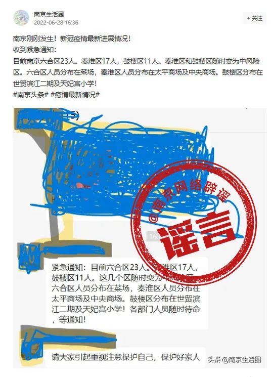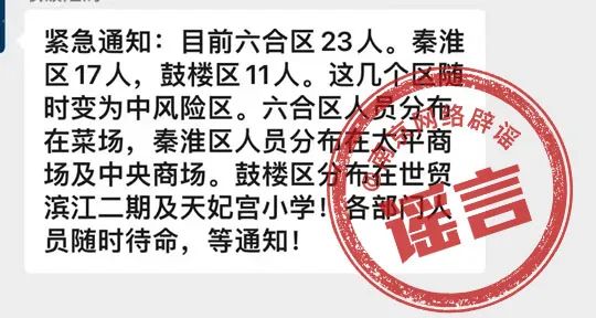 6月28日,網(wǎng)上流傳一則以官方口吻下發(fā)的通知,稱“南京六合8例,秦淮1例”。還有消息稱“目前南京六合區(qū)23人,秦淮區(qū)17人,鼓樓區(qū)11人。秦淮區(qū)和鼓樓區(qū)隨時(shí)變?yōu)橹酗L(fēng)險(xiǎn)區(qū)。六合區(qū)人員分布在菜場(chǎng),秦淮區(qū)人員分布在太平商場(chǎng)及中央商場(chǎng)。鼓樓區(qū)分布在世貿(mào)濱江二期及天妃宮小學(xué)”。言之鑿鑿,引起了網(wǎng)民的擔(dān)憂和猜測(cè)?! ?/p>