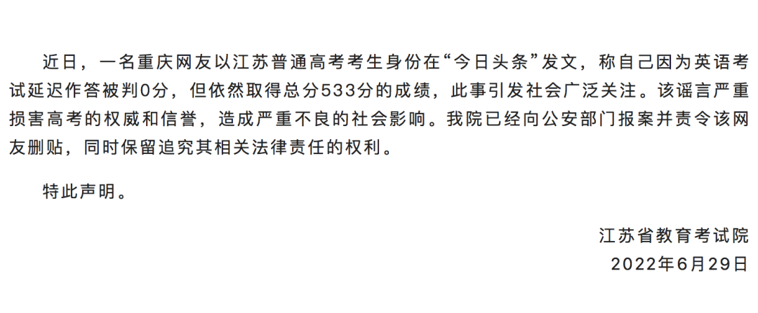 該謠言嚴(yán)重?fù)p害高考的權(quán)威和信譽(yù),造成嚴(yán)重不良的社會影響。江蘇教育考試院已經(jīng)向公安部門報(bào)案并責(zé)令該網(wǎng)友刪貼,同時保留追究其相關(guān)法律責(zé)任的權(quán)利。