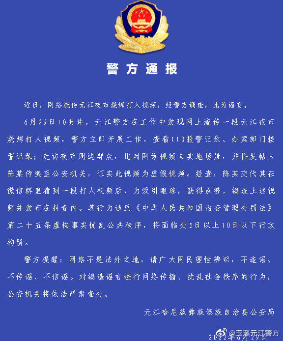 6月29日10時(shí)許,元江警方在工作中發(fā)現(xiàn)網(wǎng)上流傳一段元江夜市燒烤打人視頻,警方立即開(kāi)展工作,查看110報(bào)警記錄、辦案部門接警記錄;走訪夜市周邊群眾,比對(duì)網(wǎng)絡(luò)視頻與實(shí)地場(chǎng)景,并將發(fā)帖人陳某傳喚至公安機(jī)關(guān),證實(shí)此視頻為虛假視頻。經(jīng)查,陳某交代其在微信群里看到一段打人視頻后,為吸引眼球,獲得點(diǎn)贊,編造上述視頻并發(fā)布在抖音內(nèi)。其行為違反《中華人民共和國(guó)治安管理處罰法》第二十五條虛構(gòu)事實(shí)擾亂公共秩序,將面臨處5日以上10日以下行政拘留。