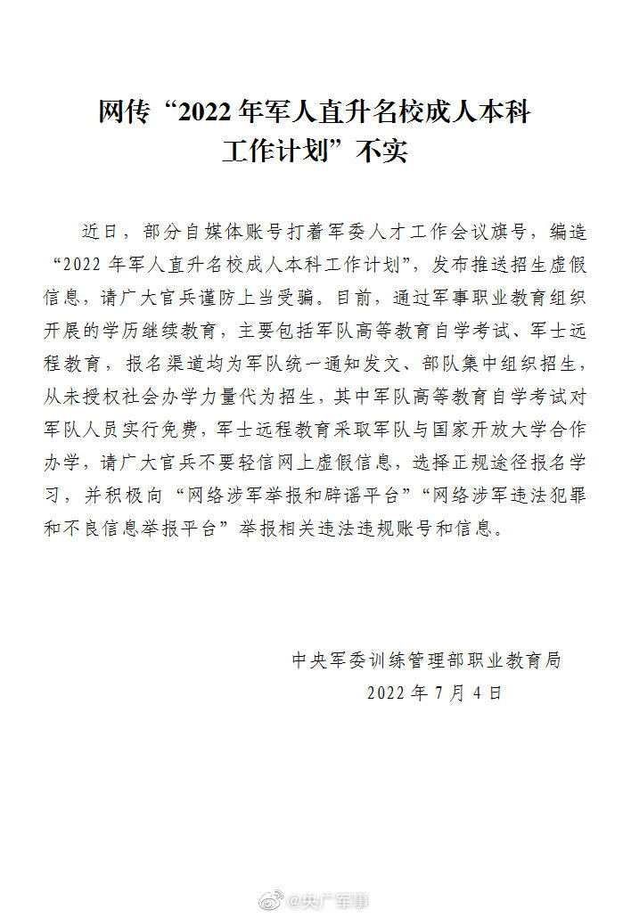 近日,部分自媒體賬號打著軍委人才工作會議旗號,編造“2022年軍人直升名校成人本科工作計劃”,發(fā)布推送招生虛假信息,請廣大官兵謹(jǐn)防上當(dāng)受騙。