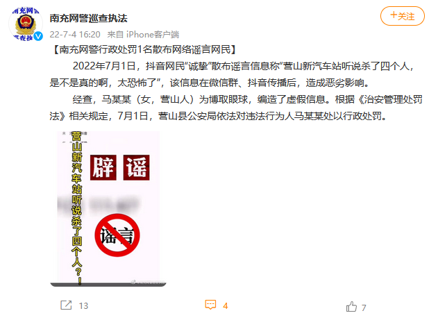 經(jīng)查,馬某某(女,營山人)為博取眼球,編造了虛假信息。根據(jù)《治安管理處罰法》相關(guān)規(guī)定,7月1日,營山縣公安局依法對違法行為人馬某某處以行政處罰。
