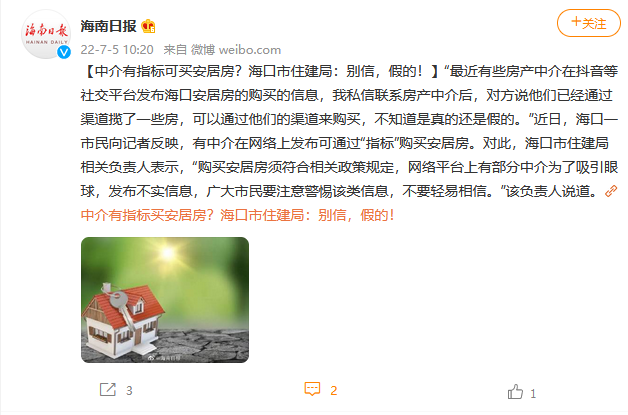 “最近有些房產(chǎn)中介在抖音等社交平臺發(fā)布??诎簿臃康馁徺I的信息,我私信聯(lián)系房產(chǎn)中介后,對方說他們已經(jīng)通過渠道攬了一些房,可以通過他們的渠道來購買,不知道是真的還是假的?!苯?,??谝皇忻裣蛐潞D峡蛻舳擞浾叻从常兄薪樵诰W(wǎng)絡(luò)上發(fā)布可以通過“指標(biāo)”購買安居房,希望媒體關(guān)注,避免市民上當(dāng)受騙。