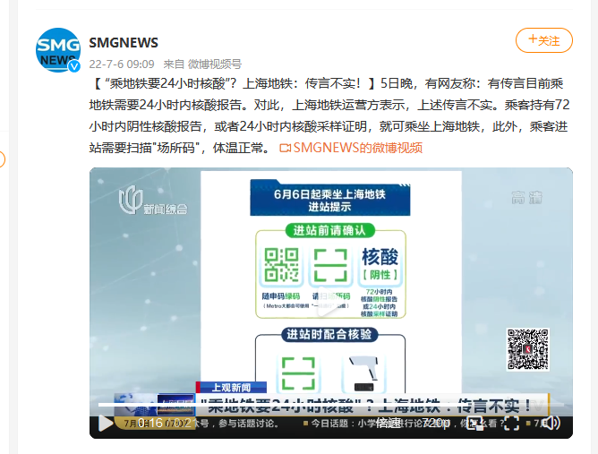 5日晚,有網(wǎng)友稱:有傳言目前乘地鐵需要24小時內(nèi)核酸報告。對此,上海地鐵運營方表示,上述傳言不實。乘客持有72小時內(nèi)陰性核酸報告,或者24小時內(nèi)核酸采樣證明,就可乘坐上海地鐵,此外,乘客進站需要掃描"場所碼",體溫正常。