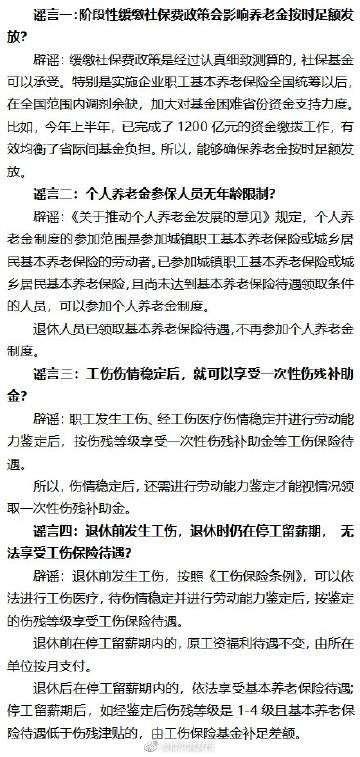 階段性緩繳社保費政策會影響?zhàn)B老金按時足額發(fā)放?個人養(yǎng)老金參保人員無年齡限制?工傷傷情穩(wěn)定后,就可以享受一次性傷殘補助金?退休前發(fā)生工傷,退休時仍在停工留薪期, 無法享受工傷保險待遇?近期這4個社保謠言別上當(dāng)。 ???