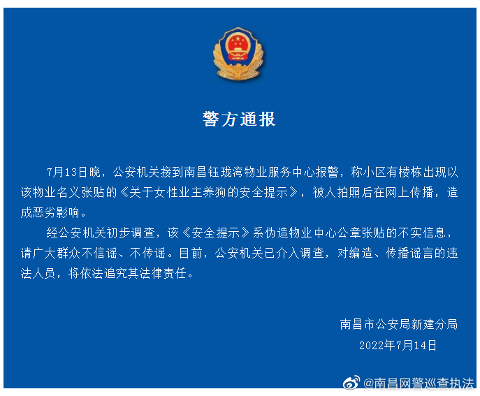 7月13日晚,公安機關(guān)接到南昌鈺瓏灣物業(yè)服務中心報警,稱小區(qū)有樓棟出現(xiàn)以該物業(yè)名義張貼的《關(guān)于女性業(yè)主養(yǎng)狗的安全提示》,被人拍照后在網(wǎng)上傳播,造成惡劣影響。