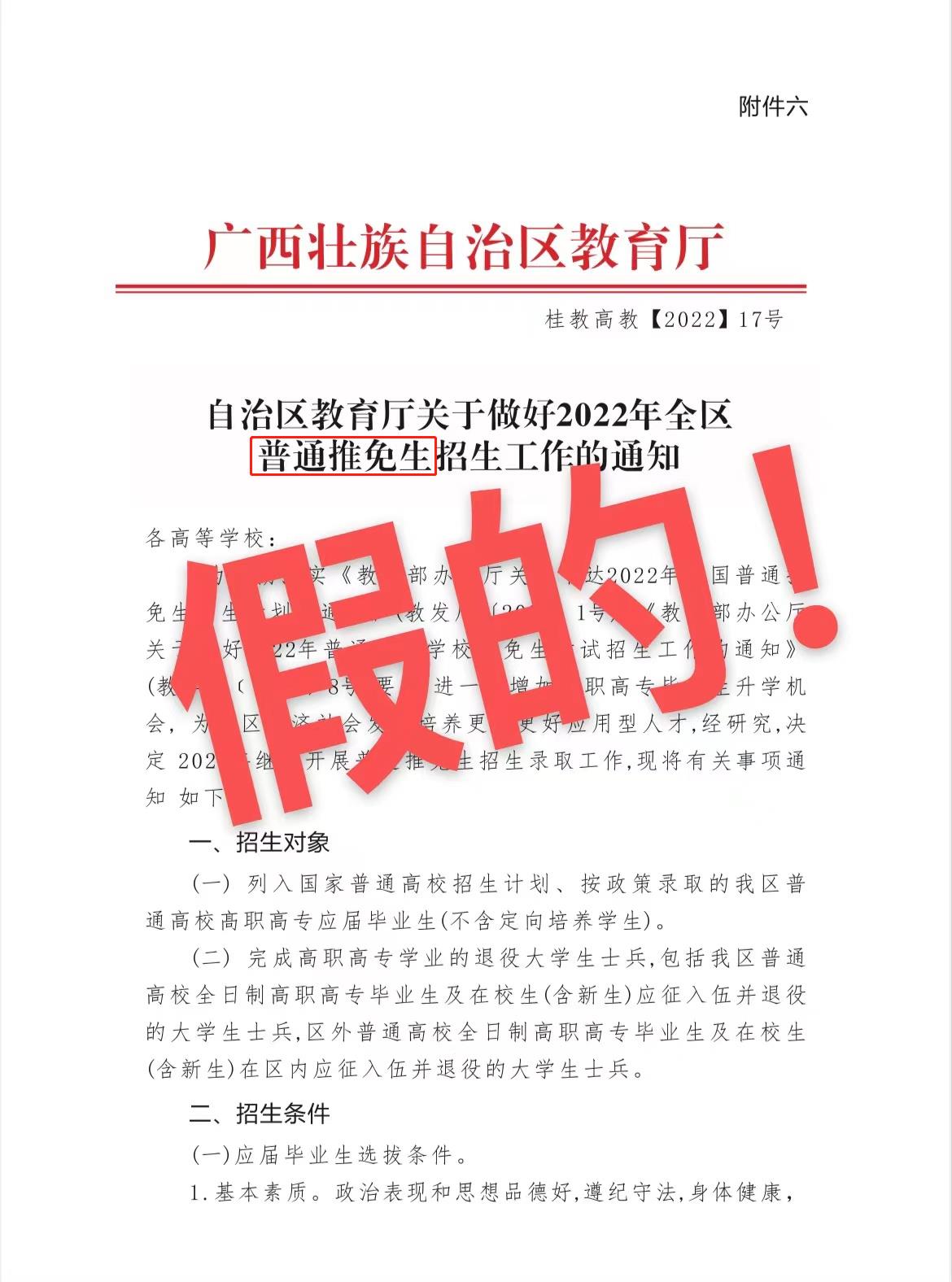 近期,有機(jī)構(gòu)和個(gè)人,盜用、篡改《自治區(qū)教育廳關(guān)于做好2022年全區(qū)普通專升本招生工作的通知》(桂教高教〔2022〕17號(hào))的文件,并捏造、散布我區(qū)存在統(tǒng)招本科“保送推免生”相關(guān)謠言,欺騙考生和家長。