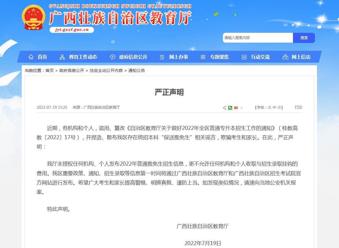 7月19日,廣西壯族自治區(qū)教育廳對(duì)此發(fā)表嚴(yán)正聲明,自治區(qū)教育廳未授權(quán)任何機(jī)構(gòu)、個(gè)人發(fā)布2022年普通推免生招生信息,更不允許任何機(jī)構(gòu)和個(gè)人收取與招生錄取掛鉤的費(fèi)用。我區(qū)重要政策、通知、招生錄取等信息第一時(shí)間將通過廣西壯族自治區(qū)教育廳和廣西壯族自治區(qū)招生考試院官方網(wǎng)站進(jìn)行發(fā)布。