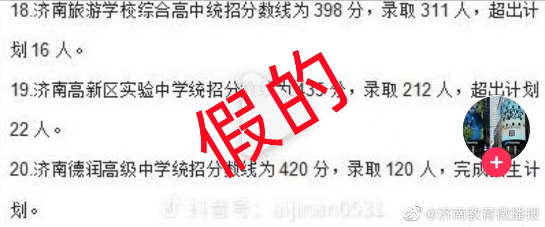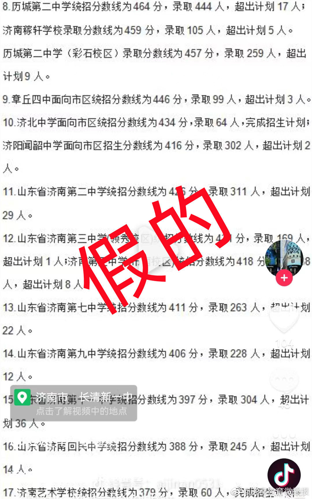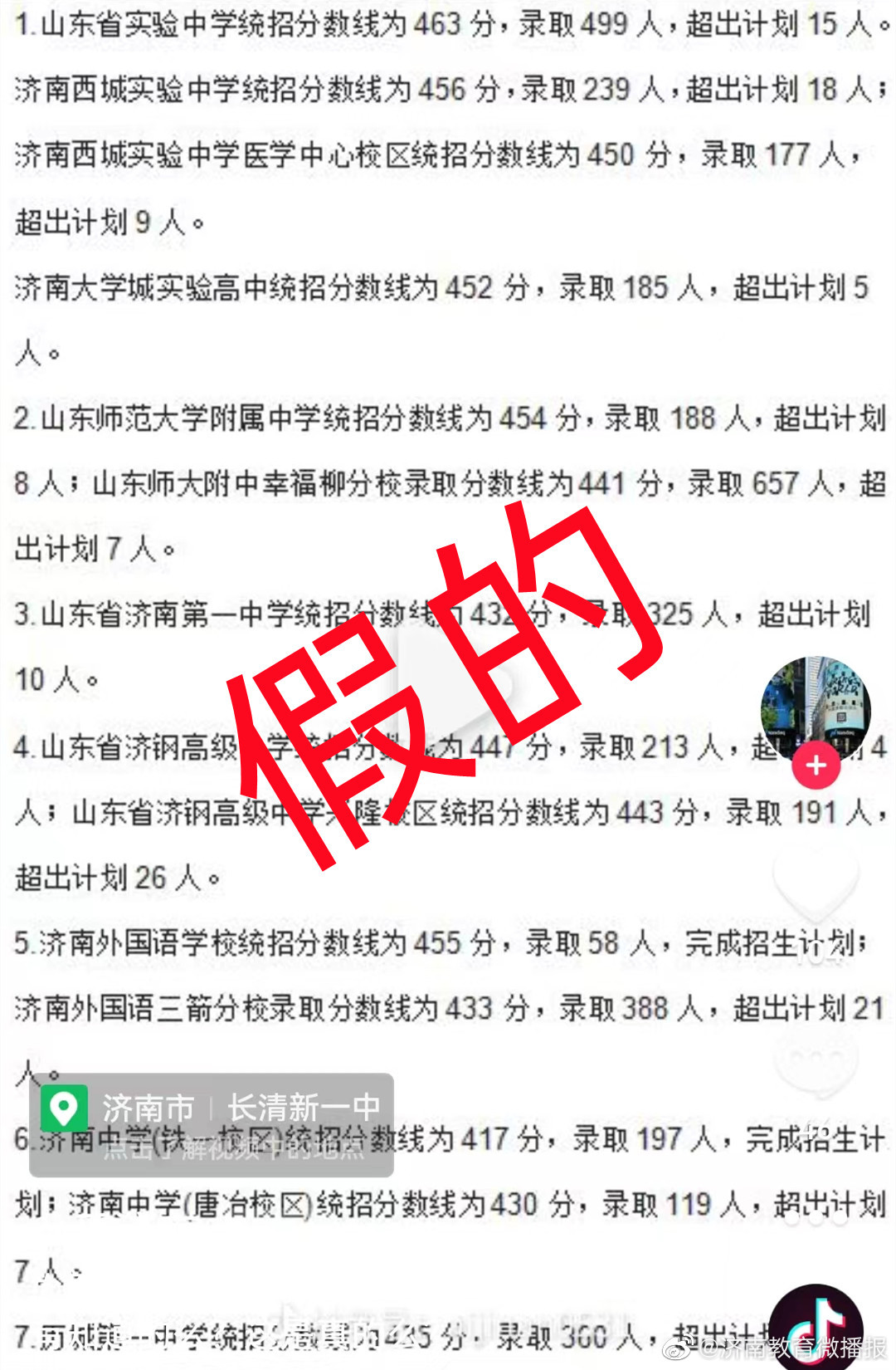 7月19日,所謂“”普通高中學(xué)校統(tǒng)招分?jǐn)?shù)線”的圖片在抖音、快手等網(wǎng)絡(luò)平臺(tái)傳播。濟(jì)南市教育局中招辦特此聲明,第二批次志愿填報(bào)錄取情況尚未公布,網(wǎng)傳圖片失實(shí),請(qǐng)廣大網(wǎng)友不信謠,不傳謠,以官方發(fā)布權(quán)威信息為準(zhǔn)。 ???