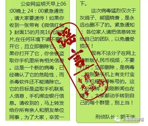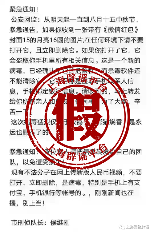 從截屏看,本次傳播的謠言與6年前傳播的主題一致,措辭也基本一致,只有些許字詞不同。例如,6年前的謠言是“明天早上06:00晚上24:00緊急通告”變成“從明天起一直到八月十五中秋節(jié)緊急通告”;“15的月亮16元”改成“15的月亮16圓”;落款所謂的“刑偵隊(duì)長(zhǎng):郭于浩”改為“市刑偵隊(duì)長(zhǎng):侯繼剛”等。以上變化并沒(méi)有改變?cè)搨餮哉Z(yǔ)句不通、用詞不規(guī)范的特點(diǎn),更無(wú)法更改這是一條謠言的本質(zhì)——早在6年前,微信官方就曾發(fā)布聲明,指出微信紅包圖片有病毒純屬造謠。