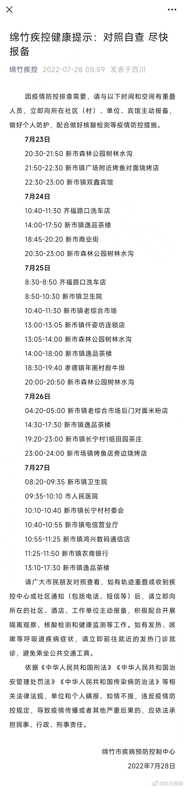 根據7月28日綿竹疾控發(fā)布的健康提示,7月23日—27日期間的“重疊軌跡”排查未涉及什邡相關區(qū)域。經核實,該網友消息為不實信息。