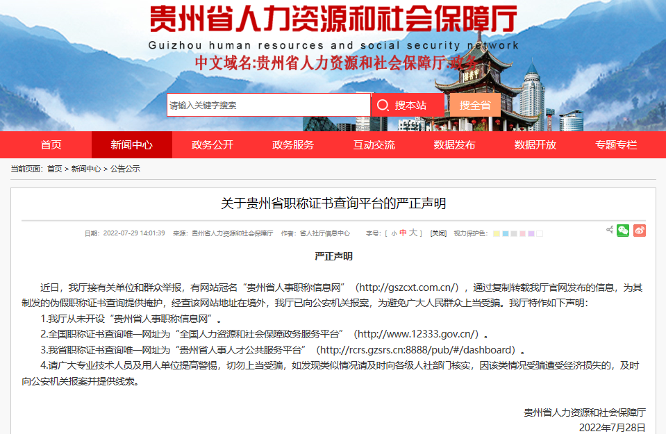 近日,貴州省人社廳接有關(guān)單位和群眾舉報,有網(wǎng)站冠名“貴州省人事職稱信息網(wǎng)”(http://gszcxt.com.cn/),通過復(fù)制轉(zhuǎn)載我廳官網(wǎng)發(fā)布的信息,為其制發(fā)的偽假職稱證書查詢提供掩護,經(jīng)查該網(wǎng)站地址在境外,貴州省人社廳已向公安機關(guān)報案,為避免廣大人民群眾上當受騙。貴州省人社廳特作如下聲明: