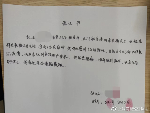 民警已對姚某進行教育,姚某認識到錯誤,并寫下保證書,保證以后不再發(fā)布類似不利于社會穩(wěn)定的謠言。目前,姚某因散布謠言涉嫌故意擾亂公共秩序,被弋陽縣公安局依法予以行政處罰。