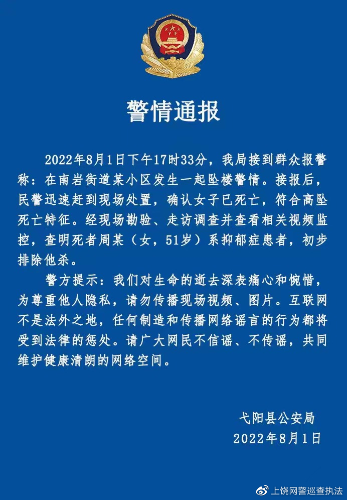 大隊民警立即展開調(diào)查,經(jīng)查實系8月1日下午17時33分,在弋陽縣南巖街道某小區(qū)發(fā)生的一起墜樓事故,墜樓女子系抑郁癥患者,初步排除他殺。