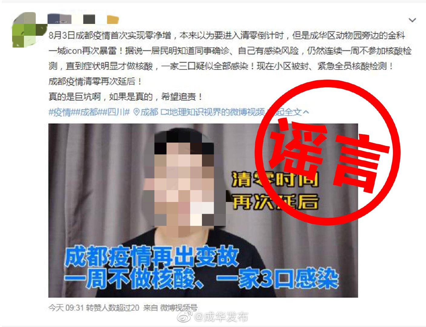 今(5)日,一則“金科一城一家三口未做核酸感染新冠”消息在網(wǎng)上流傳。據(jù)成華區(qū)新冠疫情防控指揮部核實,此信息為謠言。