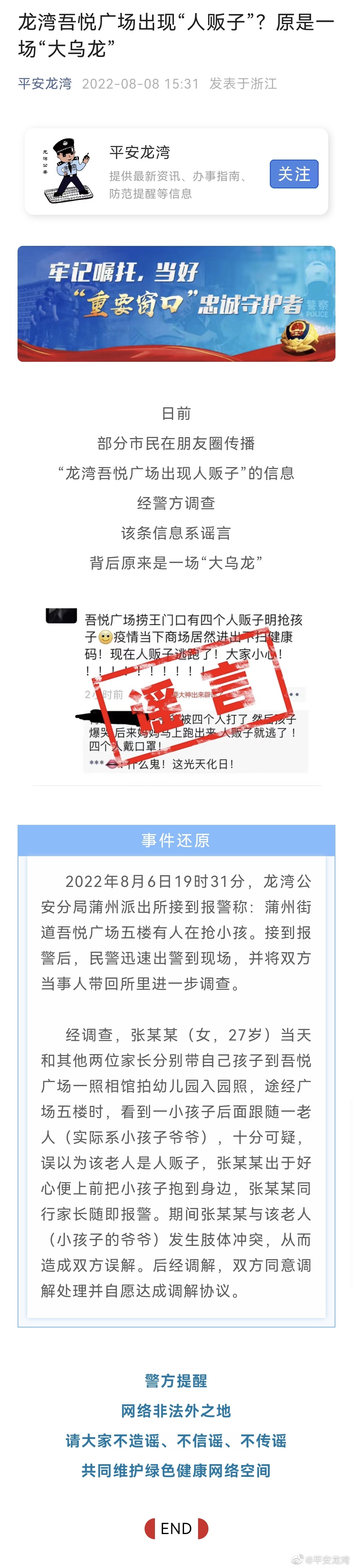 日前,部分市民在朋友圈傳播“龍灣吾悅廣場出現(xiàn)人販子”的信息,經(jīng)警方調(diào)查該條信息系謠言,背后原來是一場“大烏龍”。