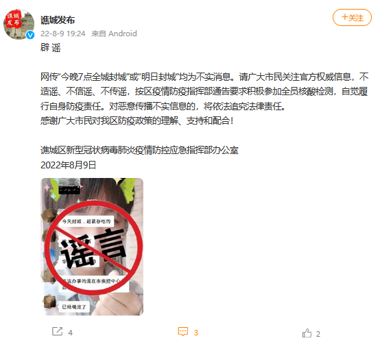 網(wǎng)傳“今晚7點全城封城”或“明日封城”均為不實消息。請廣大市民關(guān)注官方權(quán)威信息,不造謠、不信謠、不傳謠,按譙城區(qū)疫情防疫指揮部通告要求積極參加全員核酸檢測,自覺履行自身防疫責任。對惡意傳播不實信息的,將依法追究法律責任。